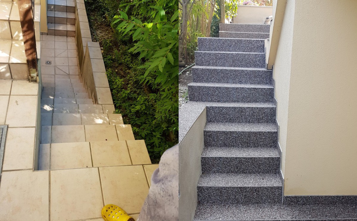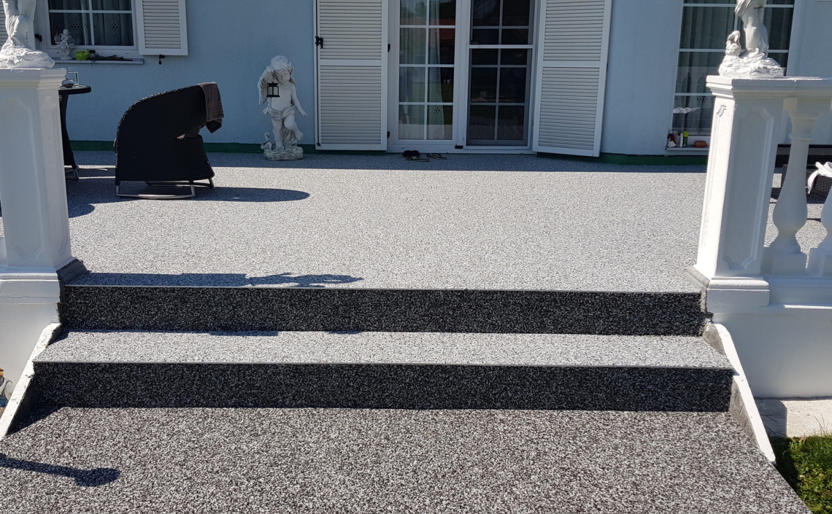 Gerne gestalten wir Ihre Terrasse mit modernen Bodenbeschichtungen wie z.B Natursteinteppich, um Ihrem Haus noch einen wunderschönen Blickfang zu geben!